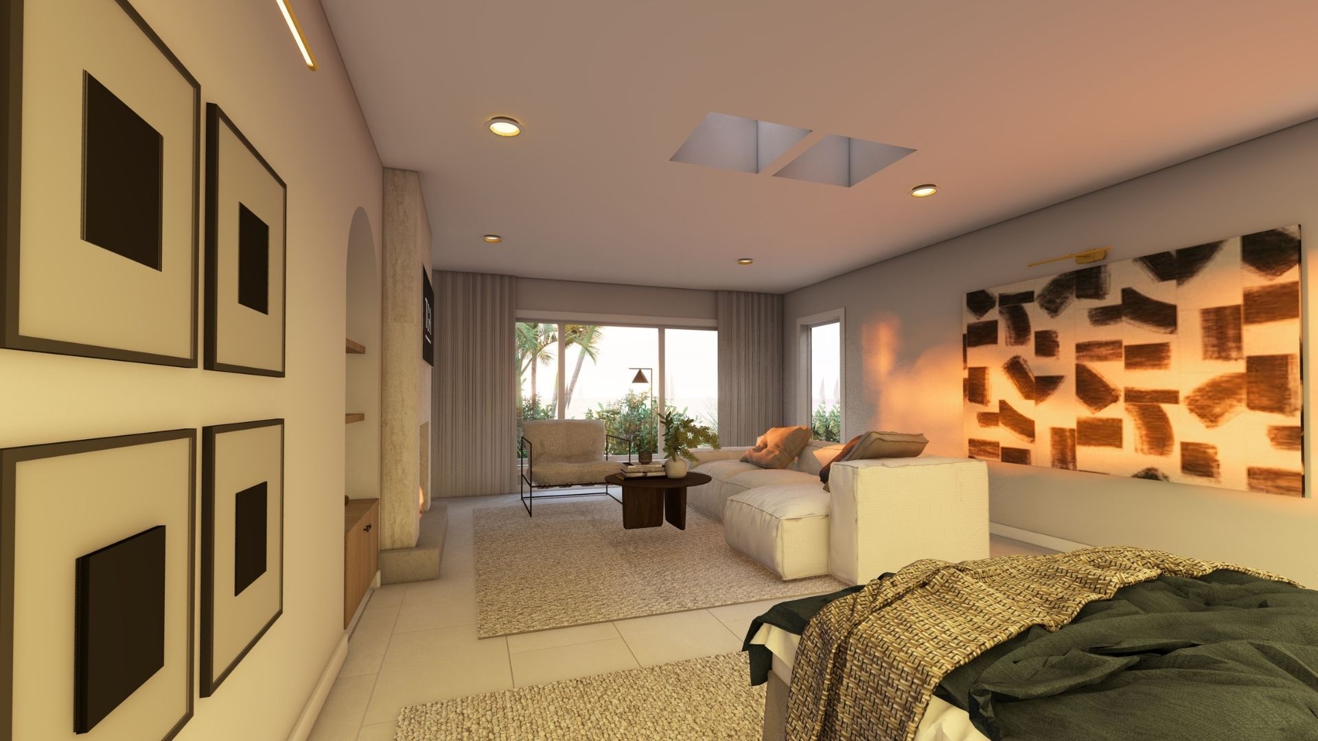 The suite includes a lounge area with a modular sofa and side table, designed for relaxation or reading. A modern fireplace and warm lighting create an intimate atmosphere, while decorative details—abstract art, plants, and carefully selected accessories—add personality and freshness.